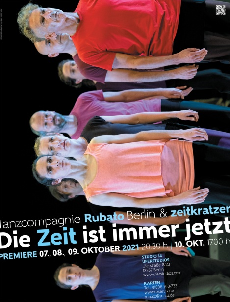 We are socially engaged in an intensive discourse on how the relationship between nature and society, nature and humans can be significantly changed and redefined. Rethinking how to deal with “time” is part of this discussion.The central aspect of our production is the phenomenon “time”. In a dialogical process, 8 dancers from the Rubato dance company and 8 musicians from the zeitkratzer ensemble meet.The aim is to unsettle familiar patterns of perception of time, to stimulate the viewer to reflect on time processes, including those of his own body. Experiencing time as a form of living existence, independent of current time economies, through dance and music.